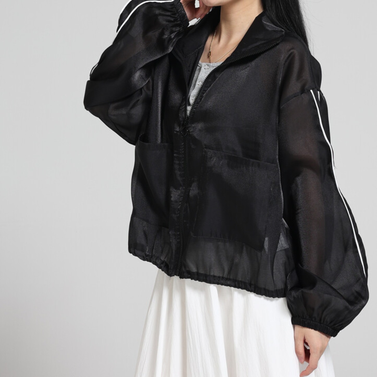 さりげない透け感と軽やかな光沢が魅力のジップブルゾン。ほんのりスポーティーなラインディテールが、甘さを抑えた大人のリラックススタイルに昇華。ややショート丈のシルエットがボトムを選ばず、羽織るだけでシーズンムード漂うスタイリングが完成します。日よけ・冷房対策にも便利な軽アウターとしても◎